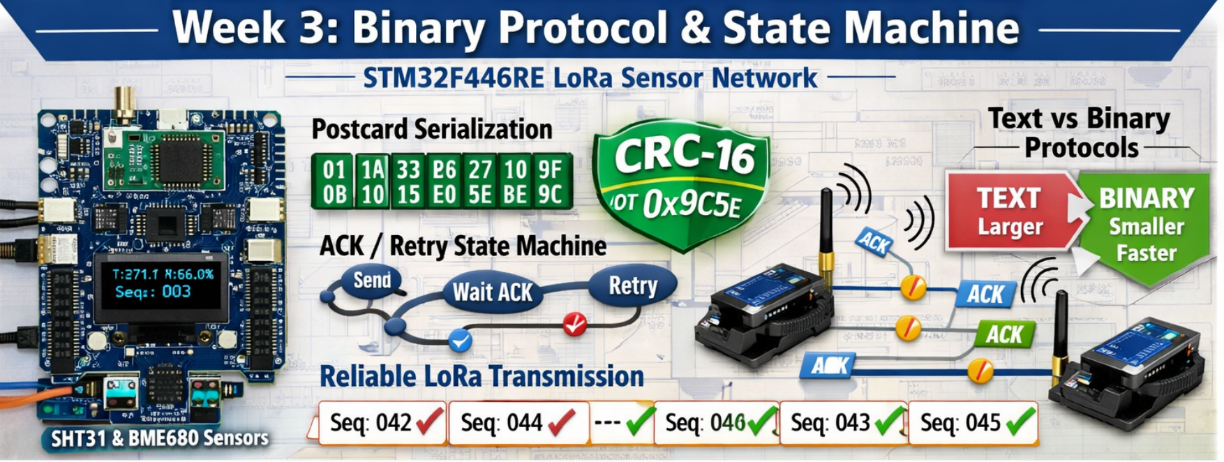 This week was about moving closer to how real embedded systems behave in the field: binary data, explicit integrity checks, and predictable delivery behavior.