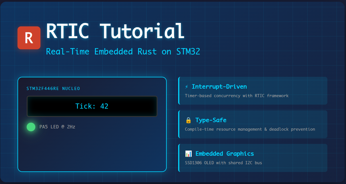 RTIC, or Real-Time Interrupt-driven Concurrency, is a framework built for embedded Rust that makes deterministic scheduling easy. It’s designed for hard real-time tasks, where timing guarantees are critical.