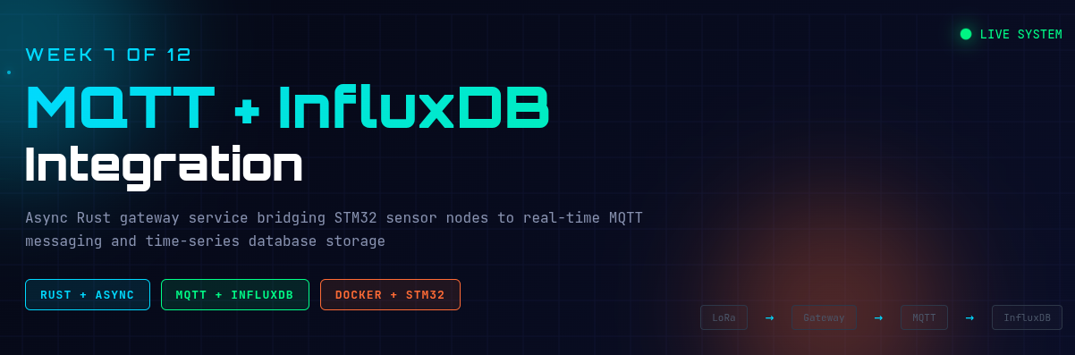 Week 7+8 was about completing the vision. Not just “adding MQTT” or “adding InfluxDB” but building the complete path from sensor to insight.